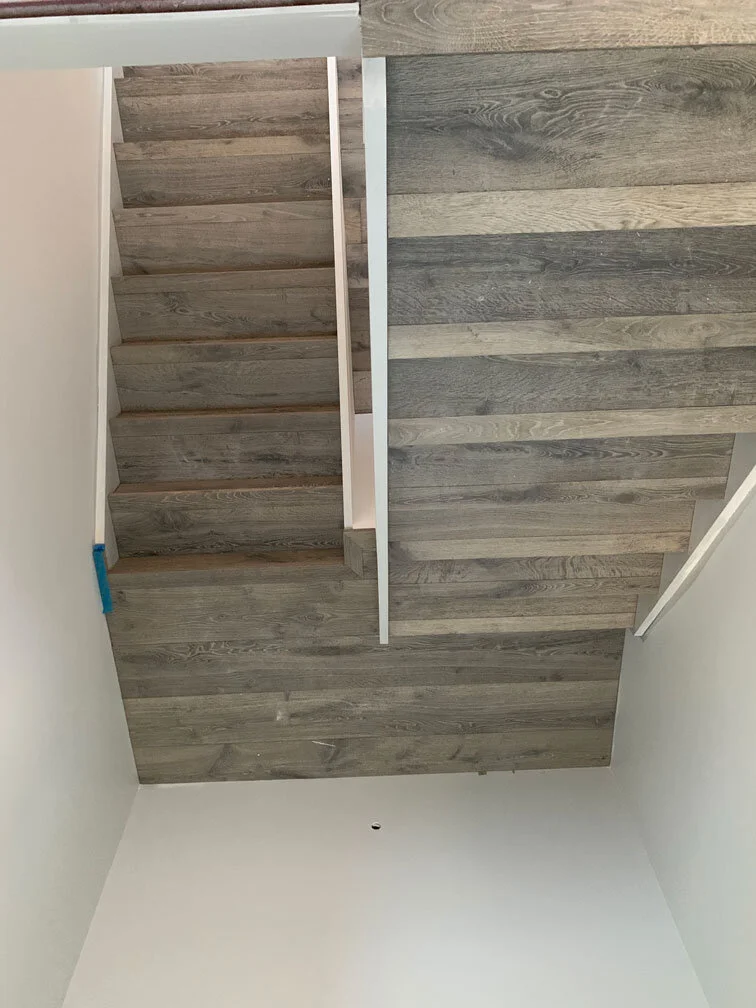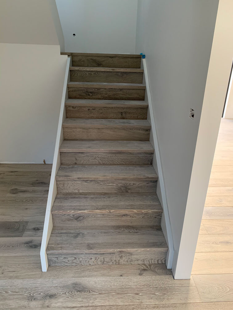 WHAT WE DID: Prep grinding - Leveling compounds - Installed Flooring – Stair overlay with bullnose.